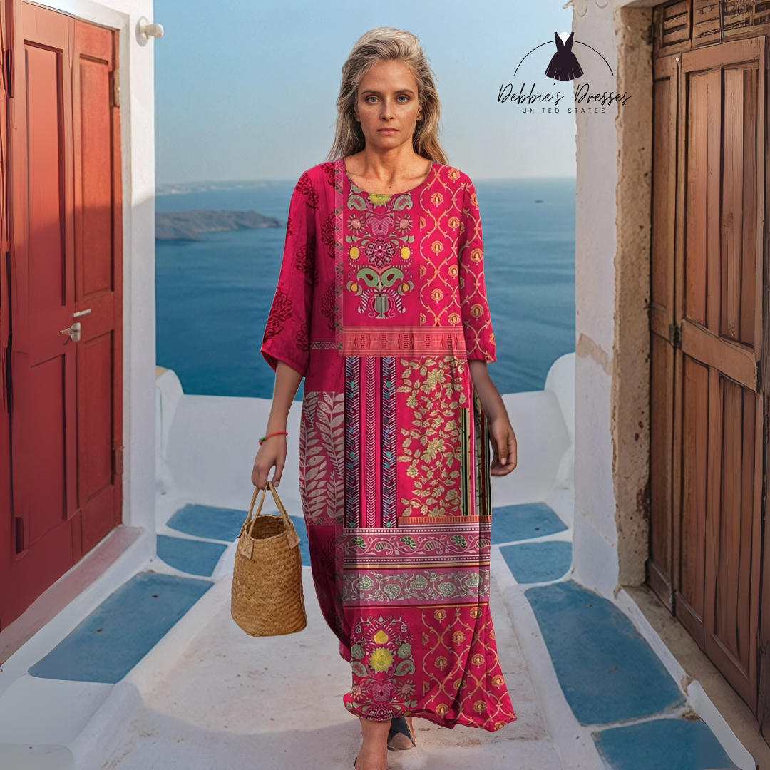 Step into a world of vibrant colors and intricate patterns with the Adeline Flowy Ethnic Dress. This beautiful piece effortlessly combines cultural charm with modern comfort, making it the perfect choice for beach strolls, casual gatherings, or vacation days.