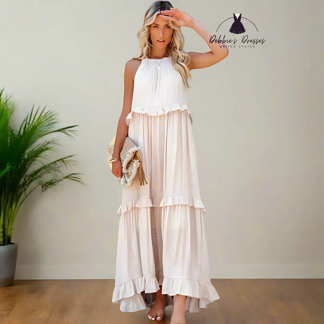 Introducing the Emilia Halter Ruffle Maxi Dress, a stunning combination of sophistication and relaxed style. This dress brings elegance to any occasion, perfect for garden parties, beach outings, or romantic evenings.