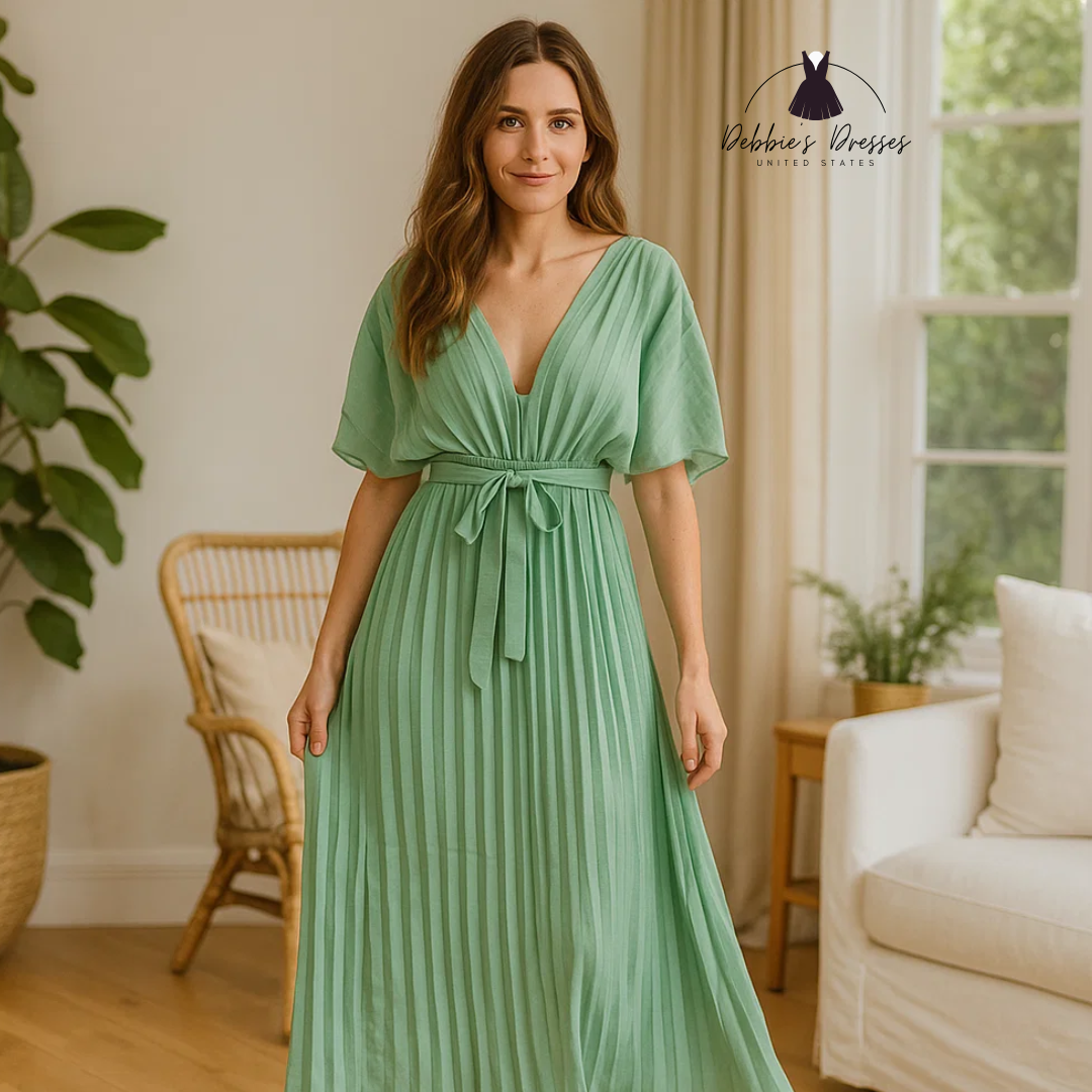 The Nerida - Pleated Elegance Dress blends fluid beauty with structured sophistication. With its sculpted pleats and flowing cape sleeves, it’s made for gala nights, weddings, and events where elegance speaks louder than words.
